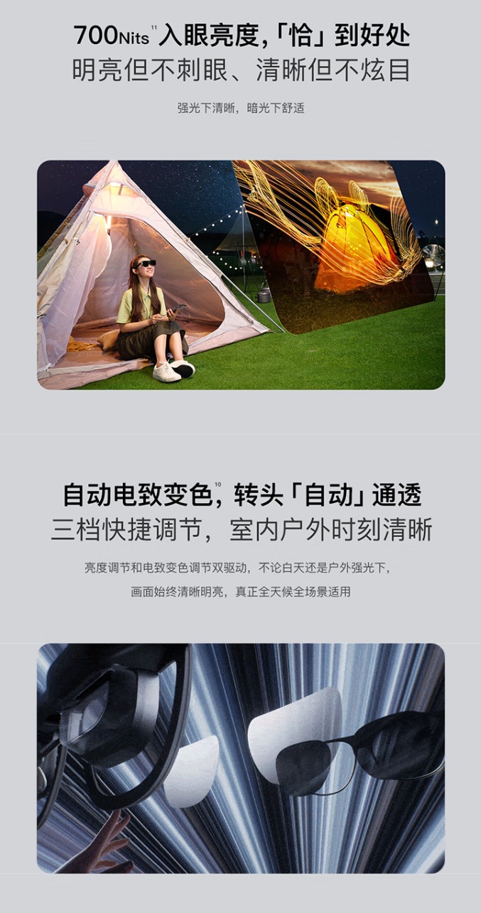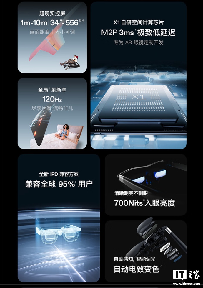 除此之外,采用全新 IPD 方案,入眼亮度可达 700 尼特,配合自动亮度调节可为用户带来“全天候”全场景适用。L 两种瞳距可选,镜腿支持三档调节,搭载 X1 自研空间计算芯片,号称“出厂逐台校色”,